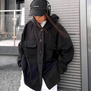 Model description: Functional spacious pockets, relaxed fit, dropped shoulders, belt, secured with two inner snaps