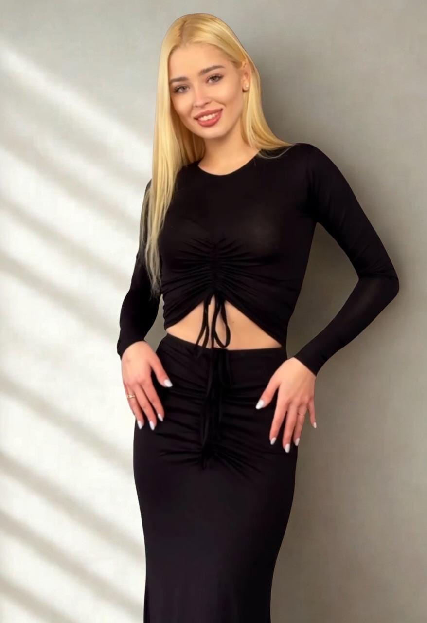 Details: • Fabric: viscose • Sizes: S, M, L • Colors: black, chocolate • Includes: crop top + maxi skirt • Soft, stretchy & comfortable • Feminine and elegant silhouette