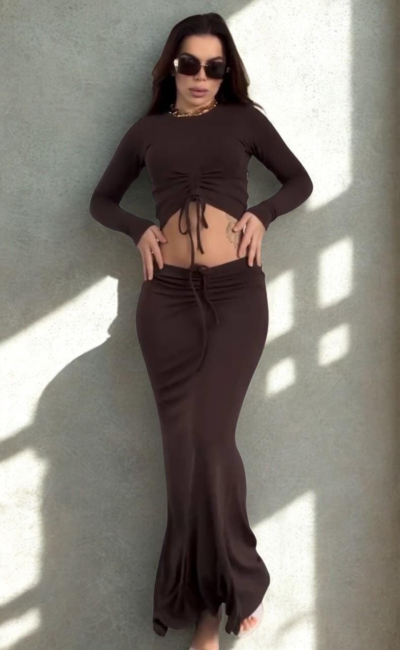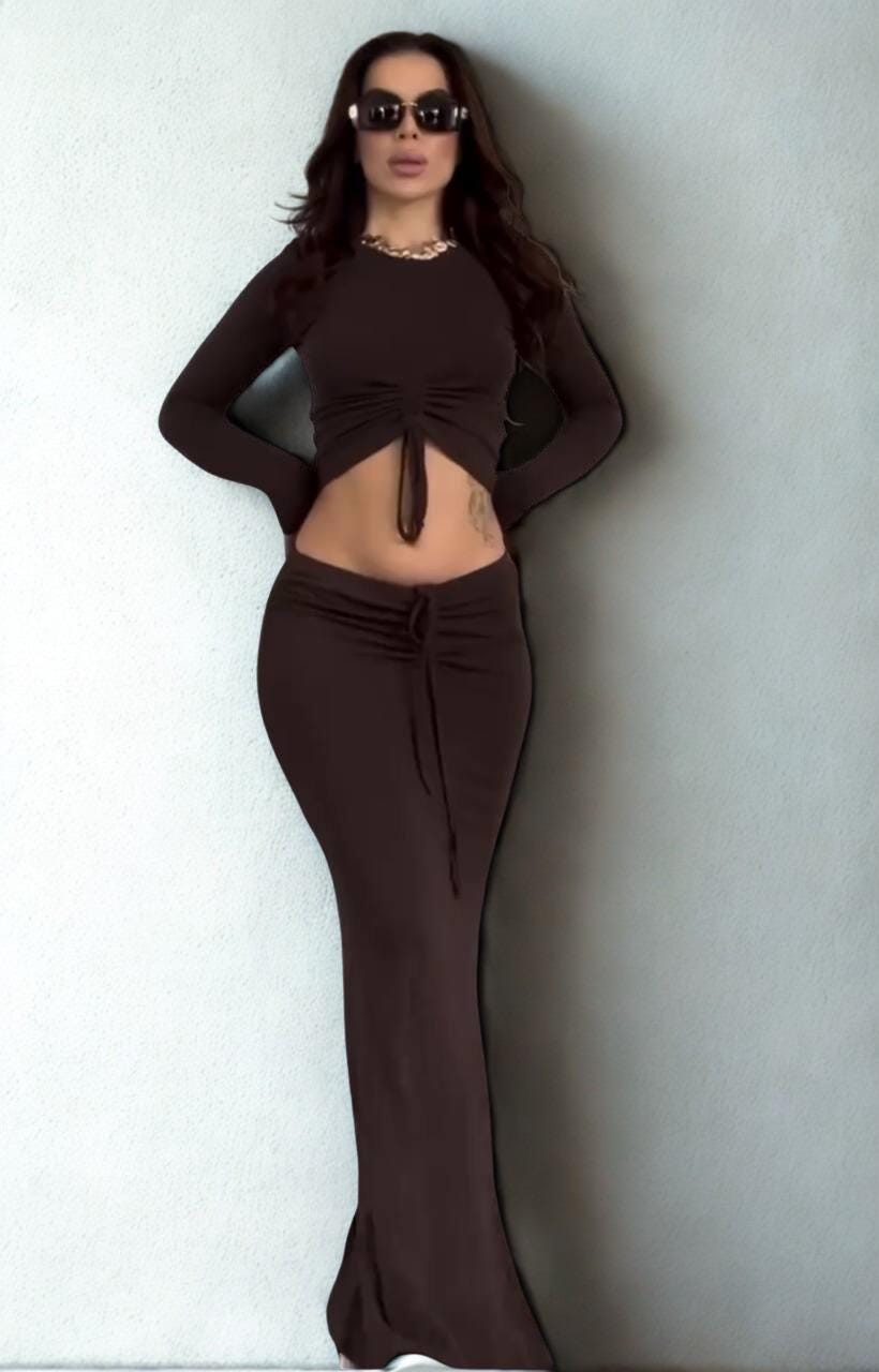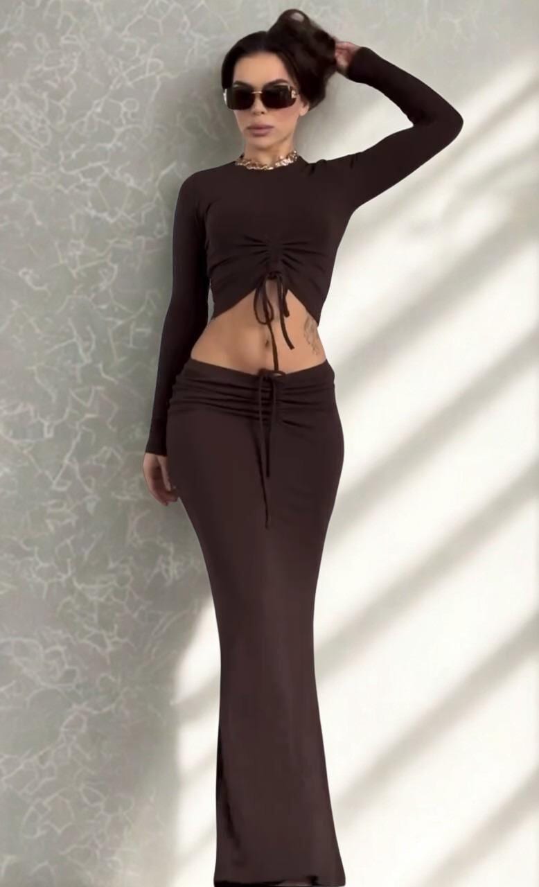 Elevate your everyday style with this soft viscose two-piece set. The outfit features a long-sleeve crop top with an adjustable drawstring front and a matching maxi skirt that perfectly highlights the silhouette. Made from high-quality viscose, it feels smooth, breathable, and comfortable for all-day wear. Ideal for city walks, evenings out, or a relaxed yet elegant look on vacation.