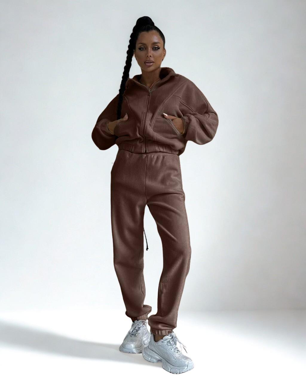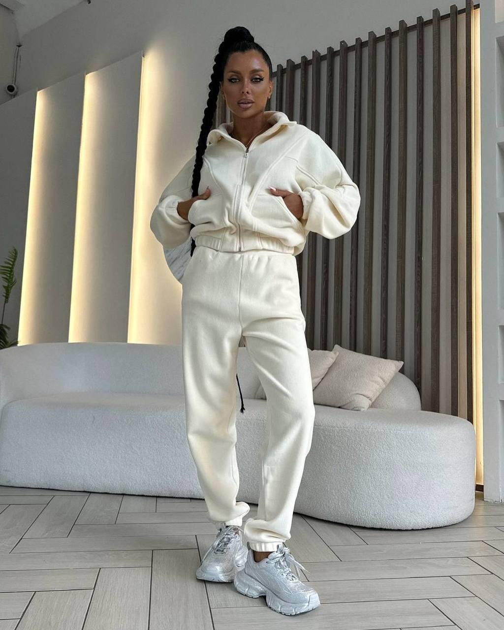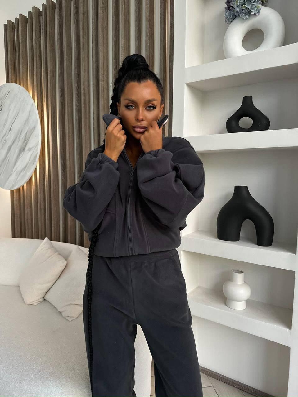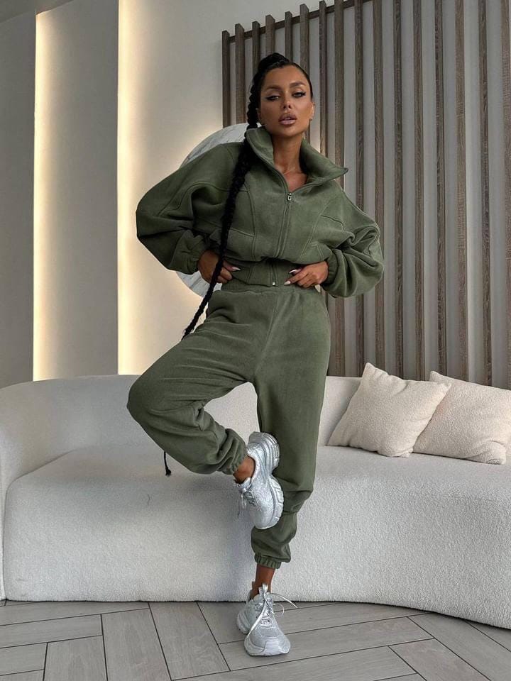 Stay warm and stylish in this soft fleece tracksuit — perfect for cozy days at home or casual outings. Made from high-quality double-sided Turkish fleece, it offers incredible warmth and comfort without sacrificing elegance. The zip-up top features a high collar and relaxed fit, while the matching pants have an elastic waistband for everyday comfort.