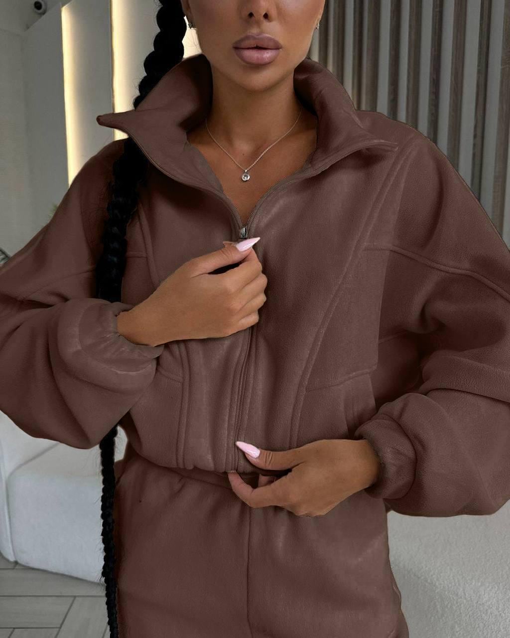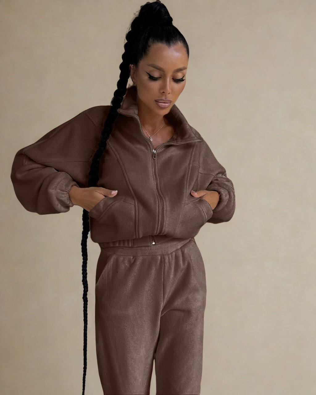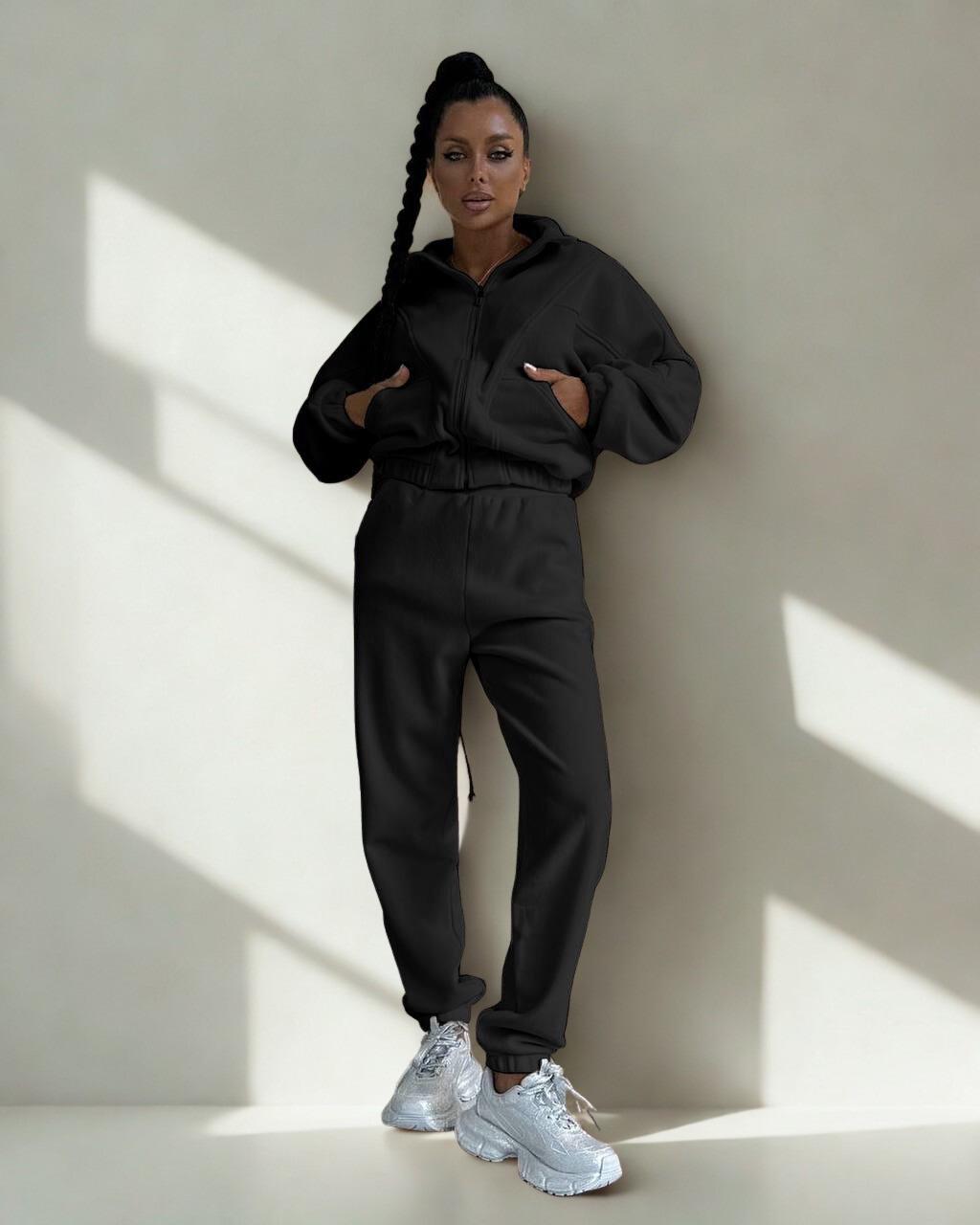 Stay warm and stylish in this soft fleece tracksuit — perfect for cozy days at home or casual outings. Made from high-quality double-sided Turkish fleece, it offers incredible warmth and comfort without sacrificing elegance. The zip-up top features a high collar and relaxed fit, while the matching pants have an elastic waistband for everyday comfort.