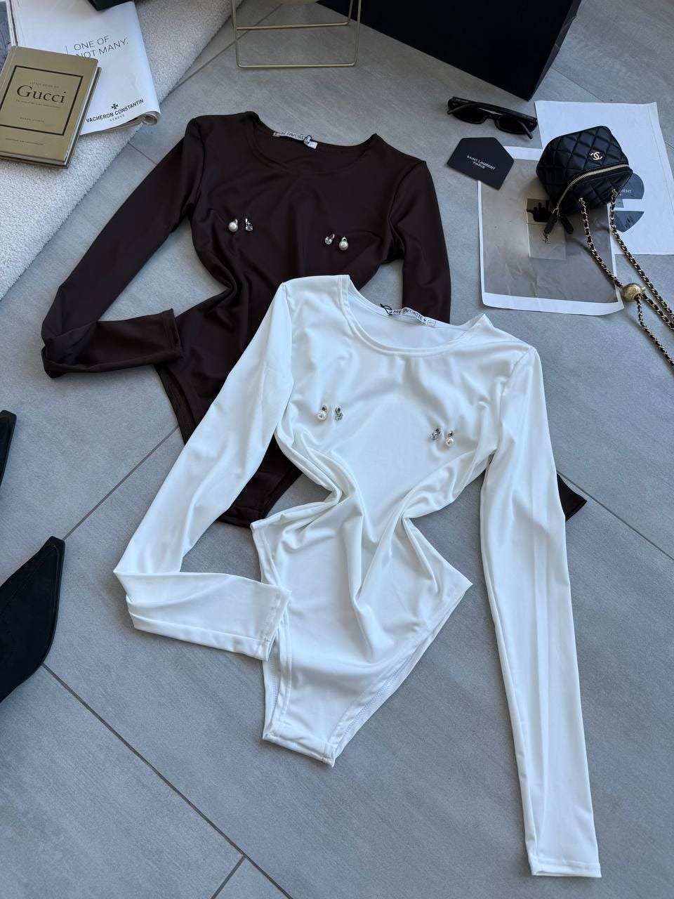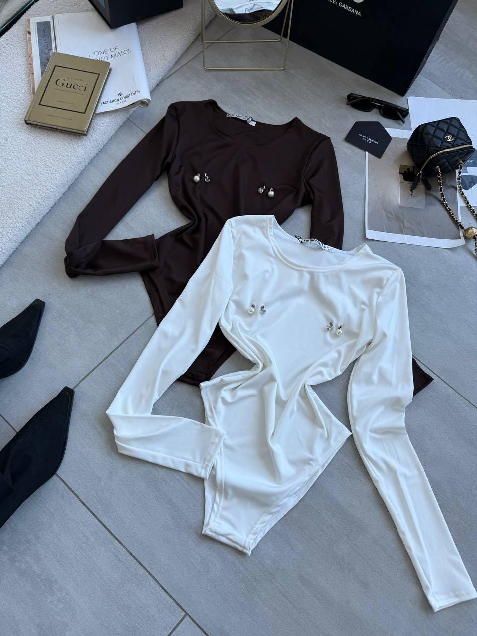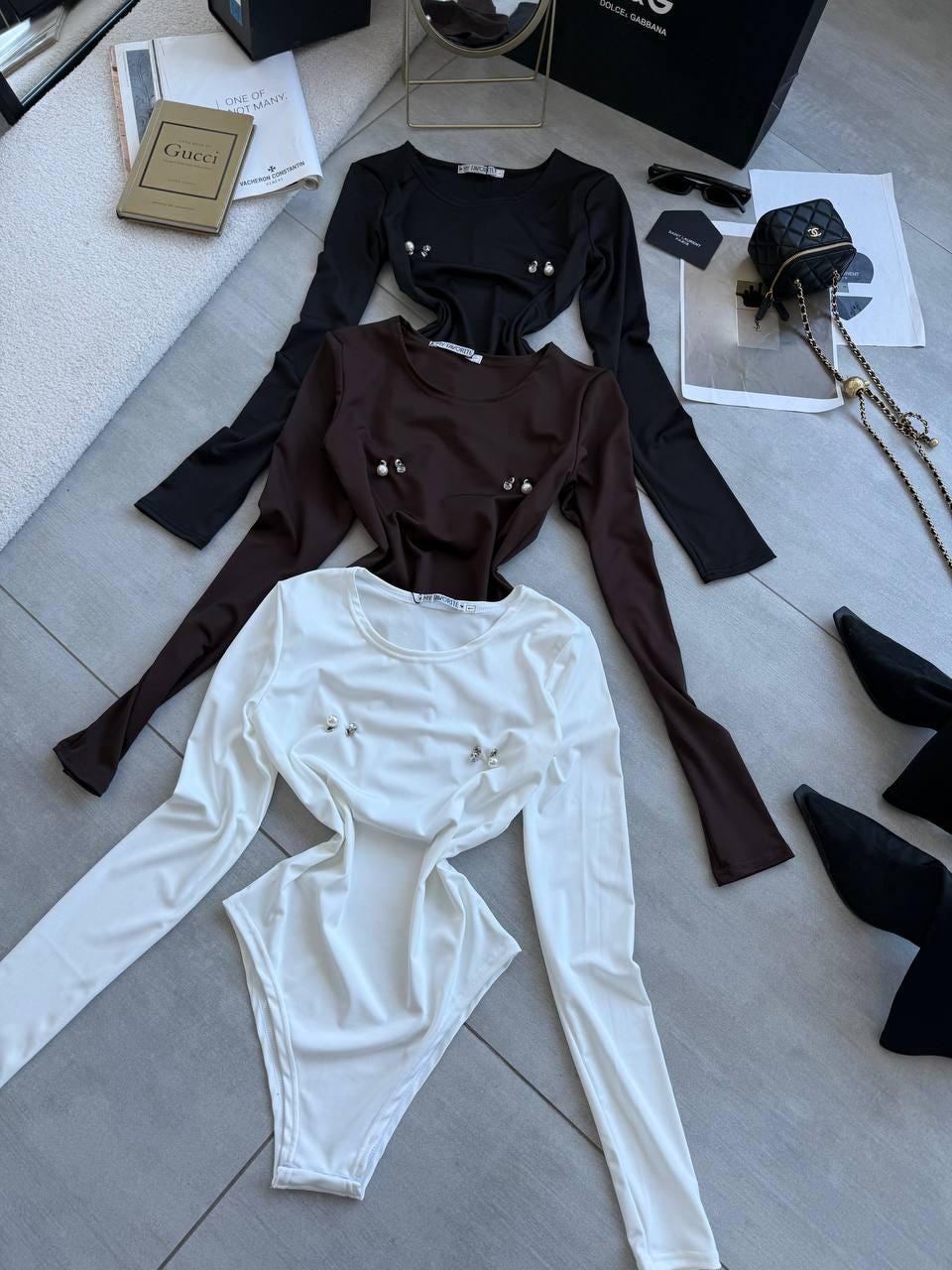 Details: • Fabric: Micro diving (elastic and smooth texture) • Sizes: S, M, L • Colors: Black, Milk, Chocolate • Design: Long sleeves, decorative pearl elements • Comfortable snap closure • Stretchy and flattering fit