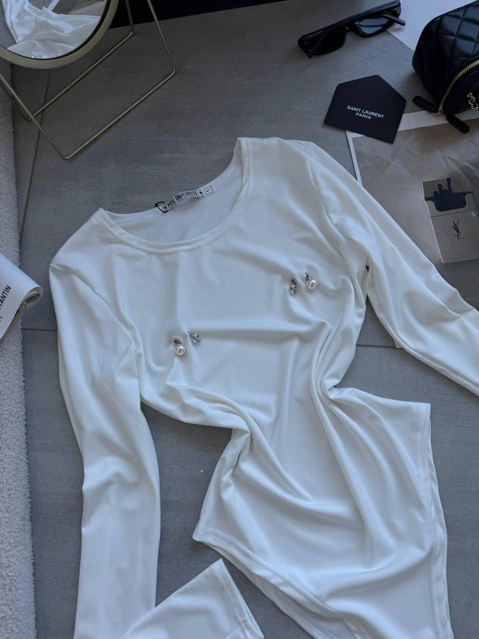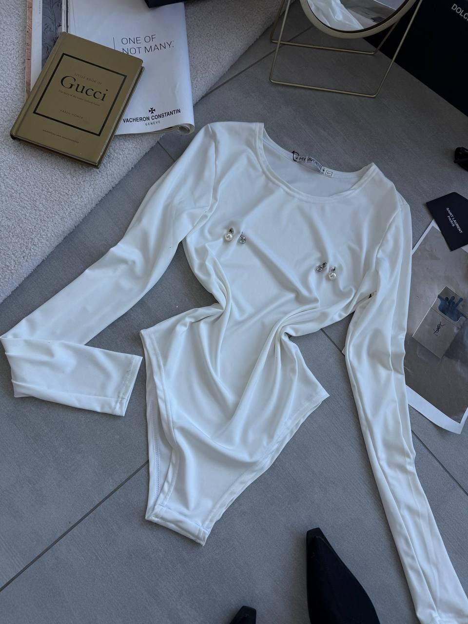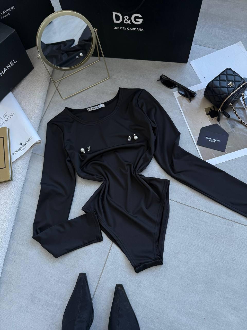 Details: • Fabric: Micro diving (elastic and smooth texture) • Sizes: S, M, L • Colors: Black, Milk, Chocolate • Design: Long sleeves, decorative pearl elements • Comfortable snap closure • Stretchy and flattering fit