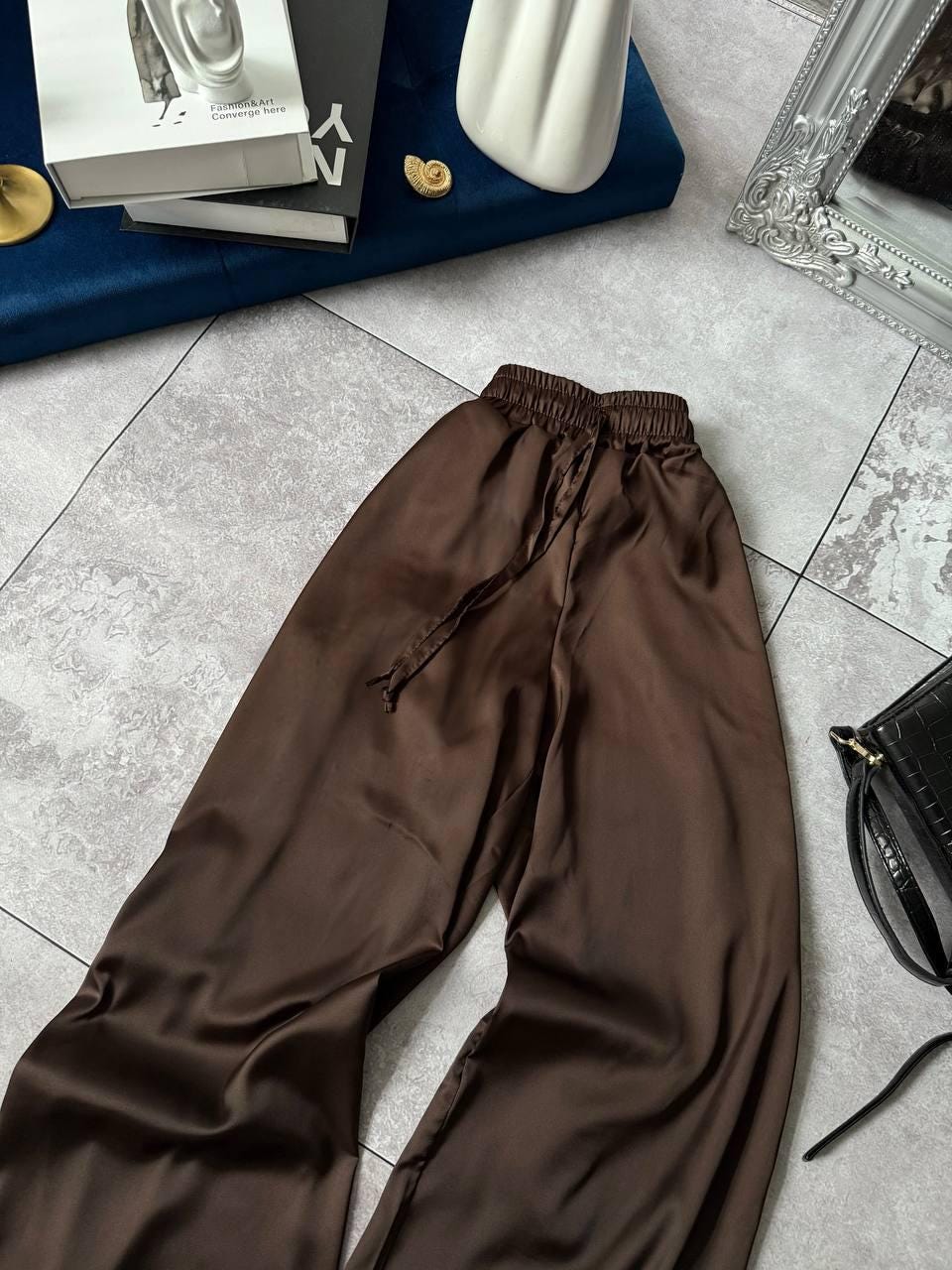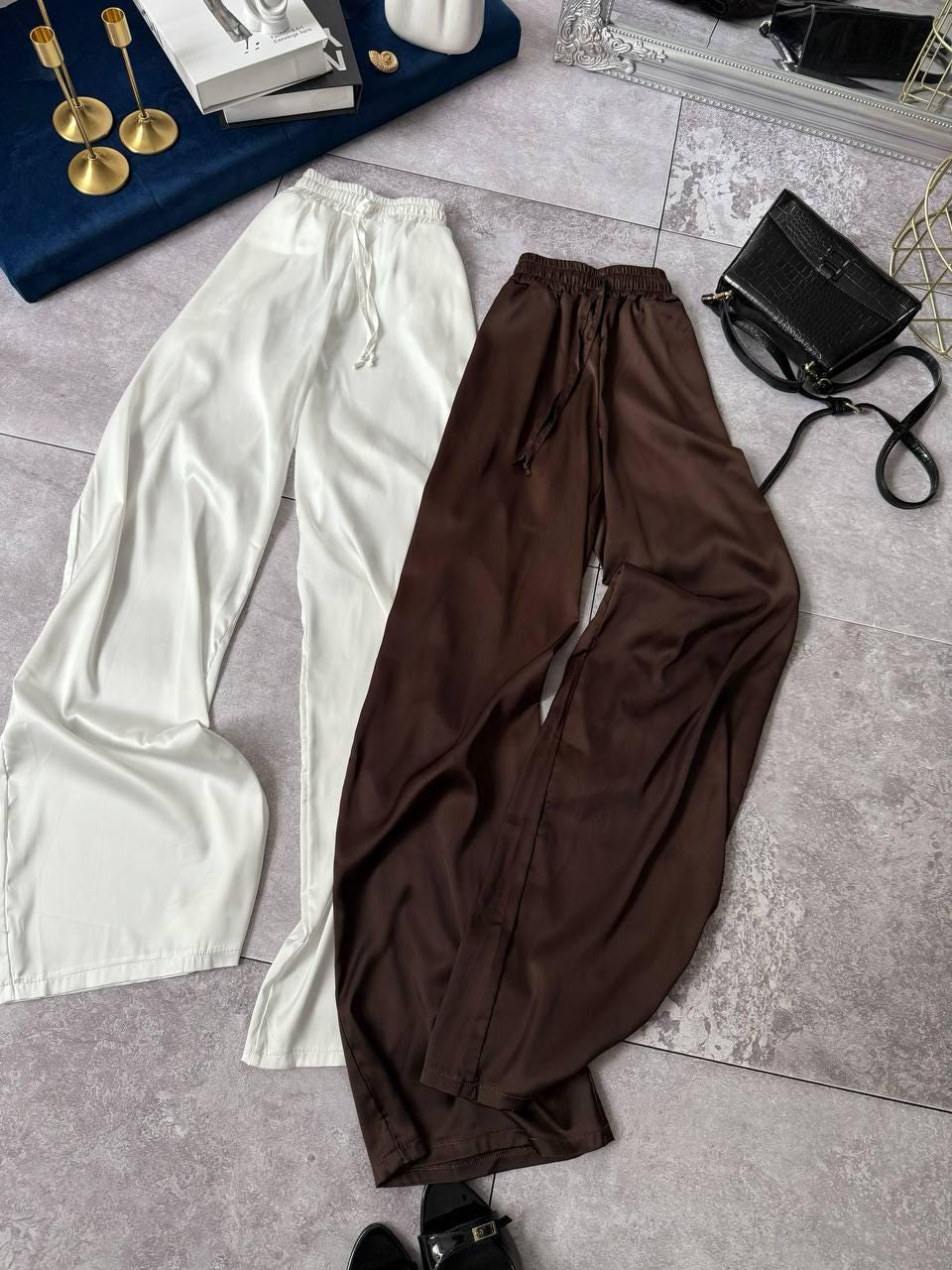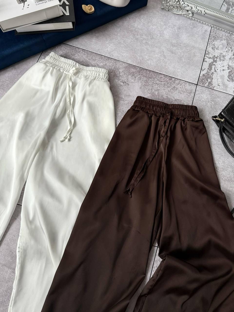 Details: • Fabric: Armani Silk • Colors: Chocolate, Black, Milk • Sizes: S, M, L • High-waist fit with elastic waistband and drawstring • Soft, lightweight, and elegant sheen • Handmade in Ukraine