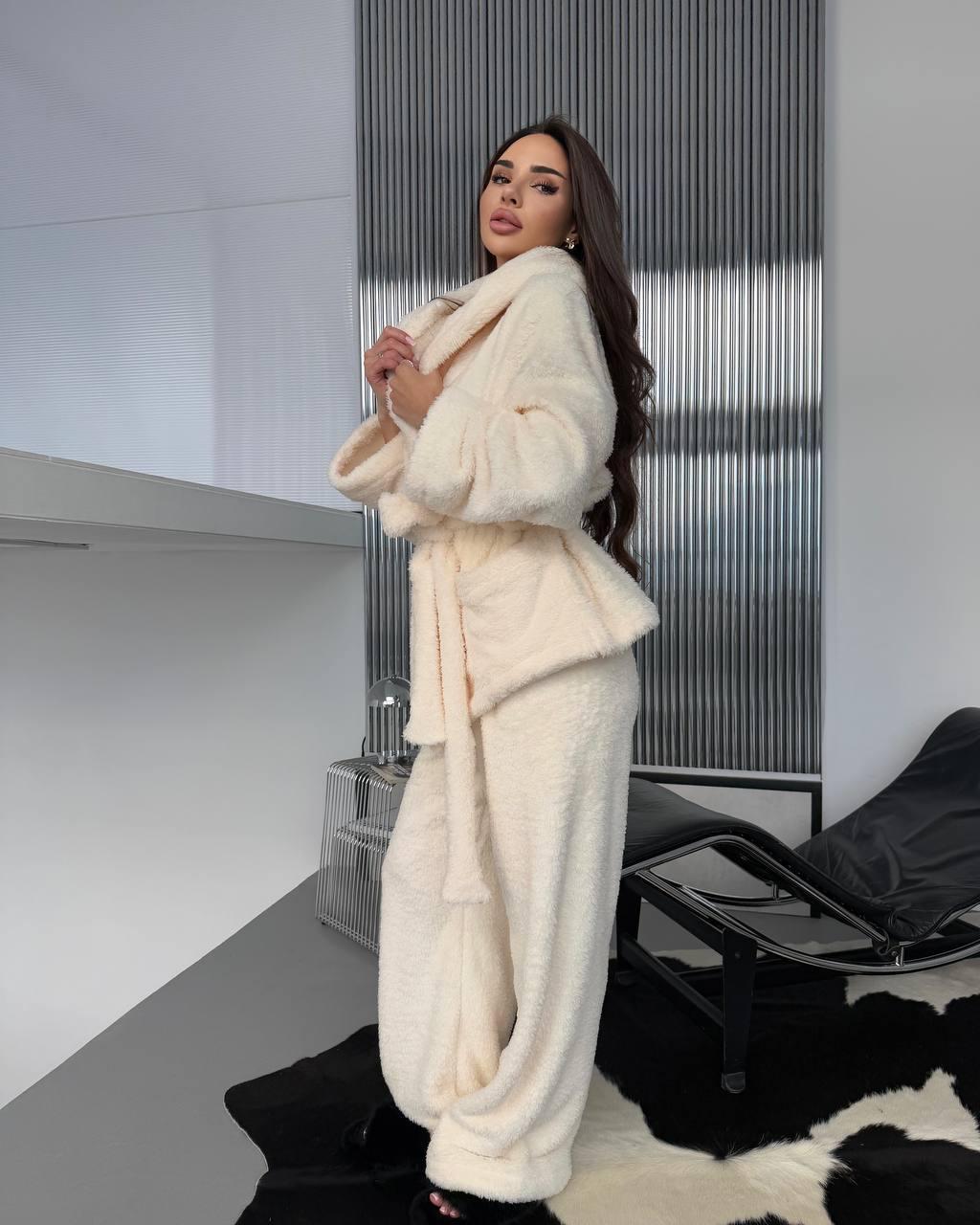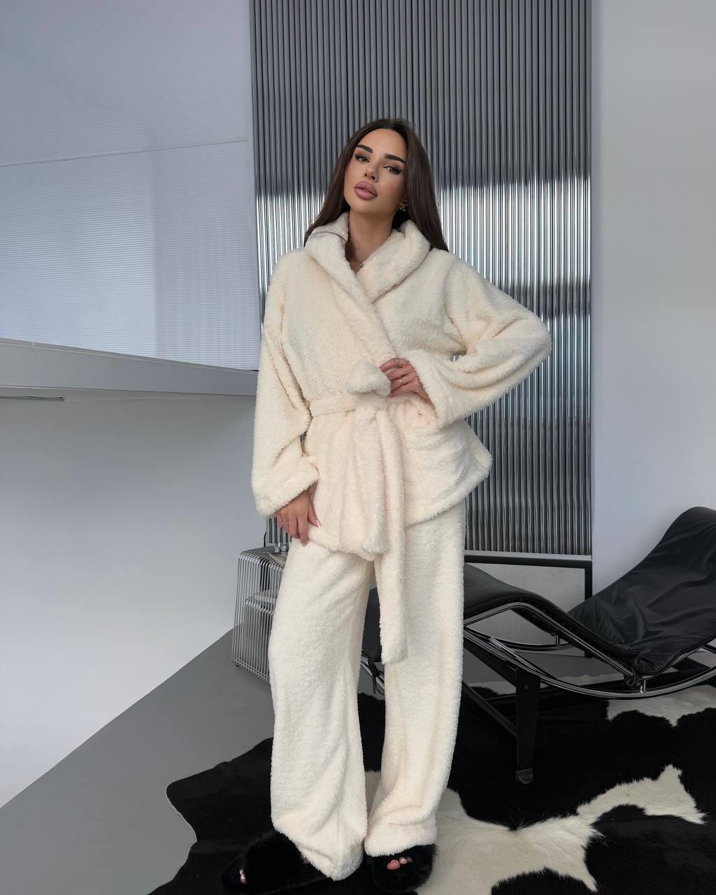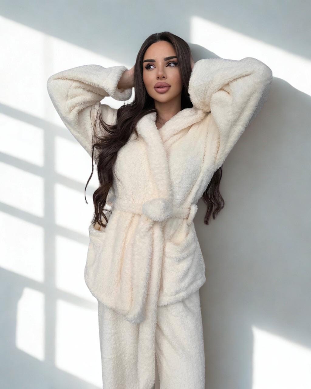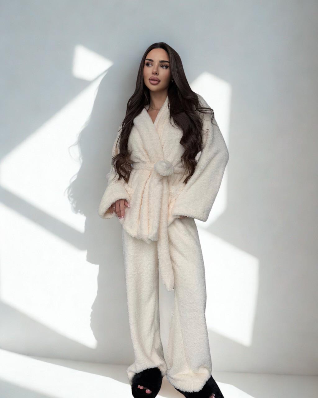 Details: • Fabric: Double-sided terry (plush fleece) • Size: One size (fits 42–46 EU) • Color: Cream (Milk) • Set includes: Belted top with pockets + matching pants • Handmade in Ukraine