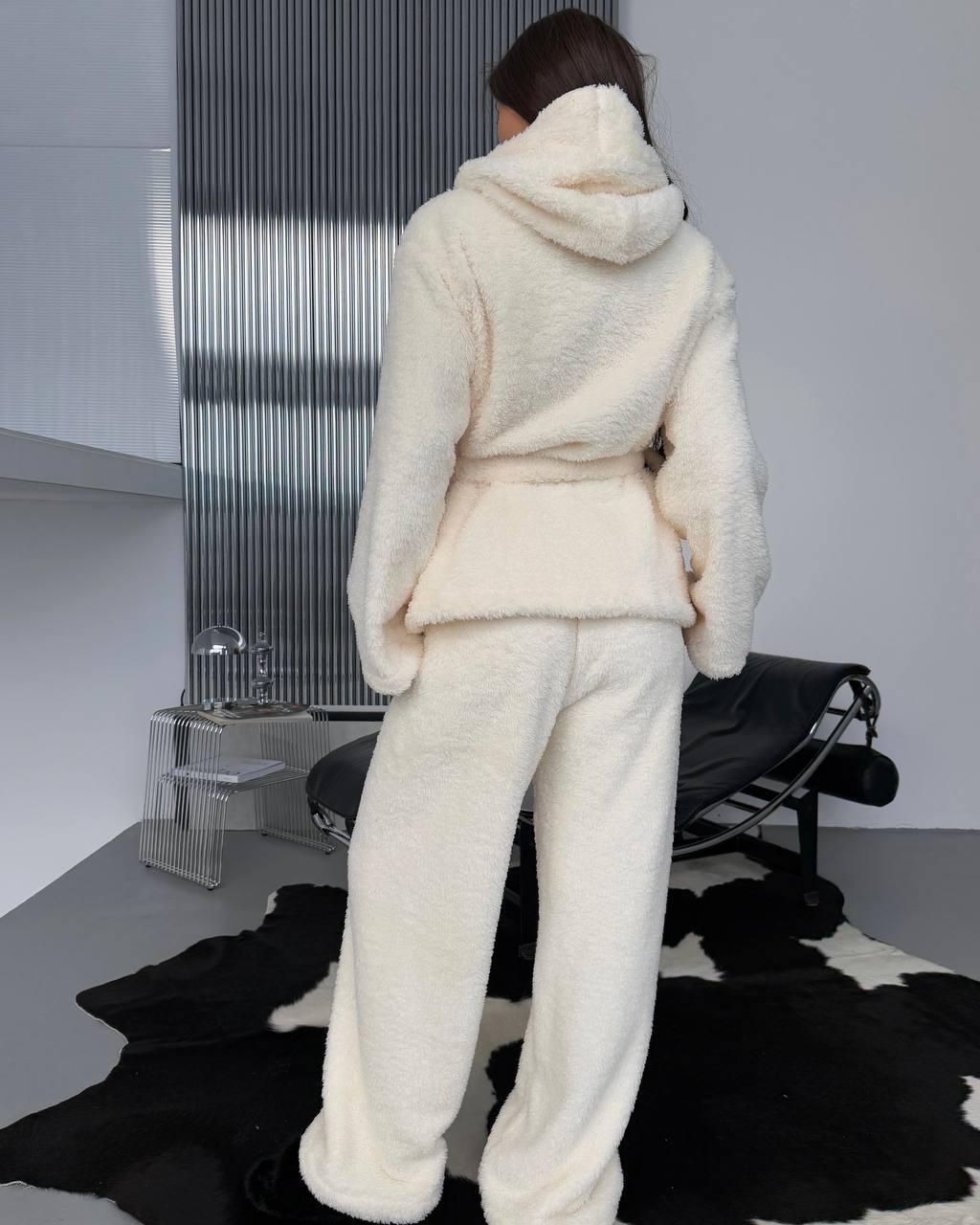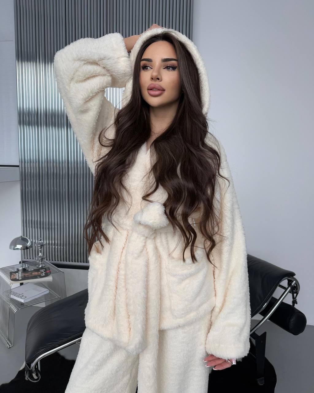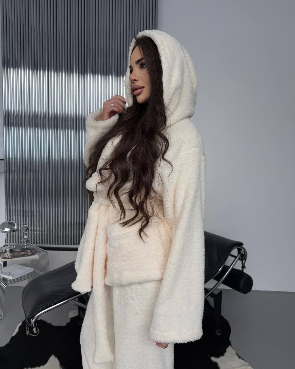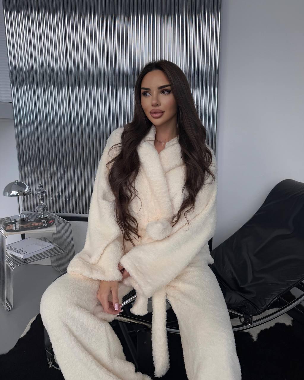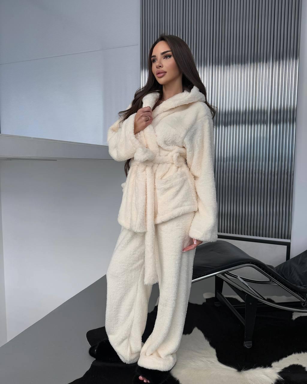 Details: • Fabric: Double-sided terry (plush fleece) • Size: One size (fits 42–46 EU) • Color: Cream (Milk) • Set includes: Belted top with pockets + matching pants • Handmade in Ukraine